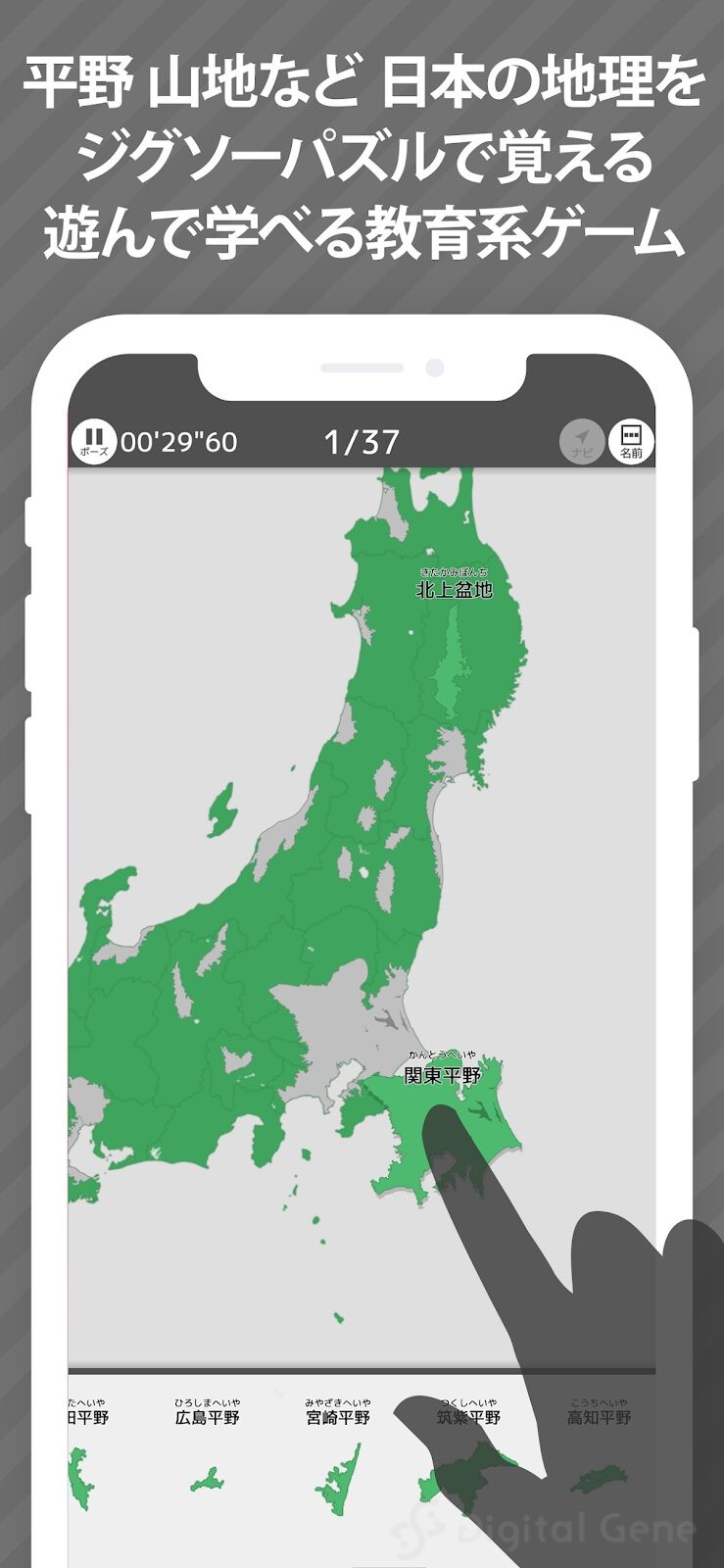 ジグソーパズル感覚で平野・山地・河川を遊んで学べることができるアプリ「あそんでまなべる 日本の地理」リリースしました。